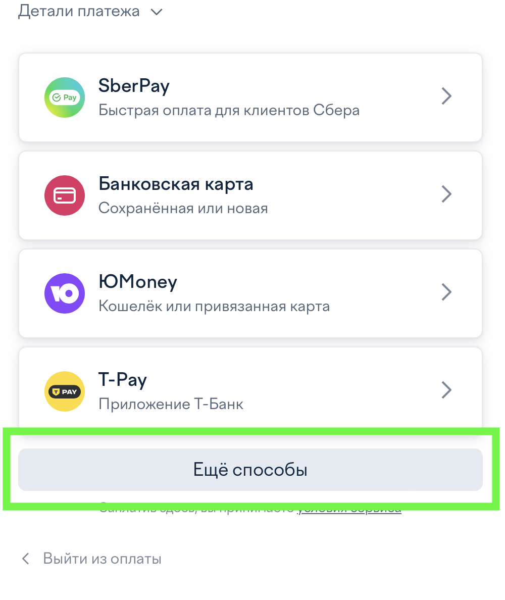 Когда откроется окно выбора способа оплаты, внимательно посмотрите в самый низ экрана. Там вы увидите кнопку «Ещё способы» (иногда она называется «Другие методы» или «Показать все»).